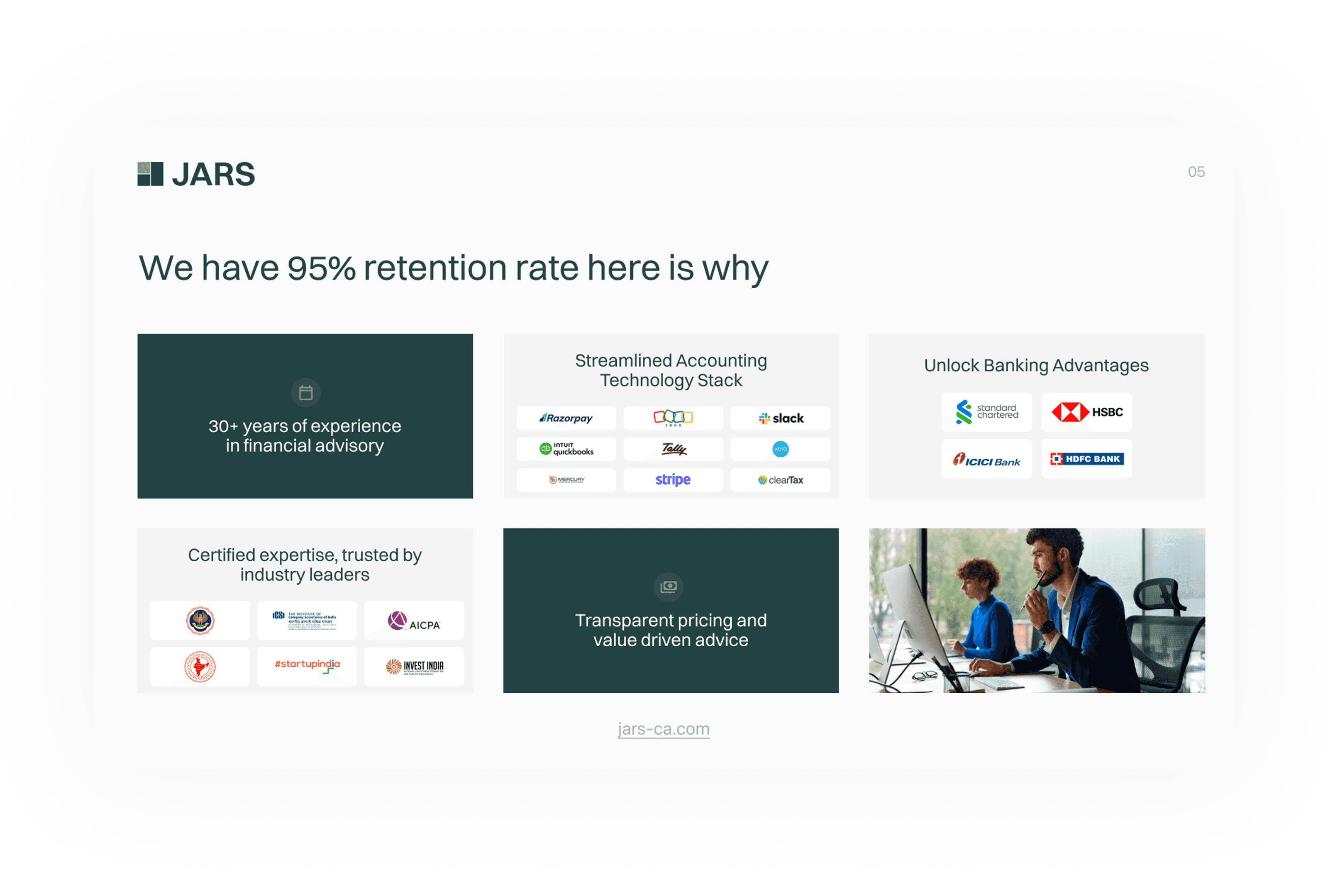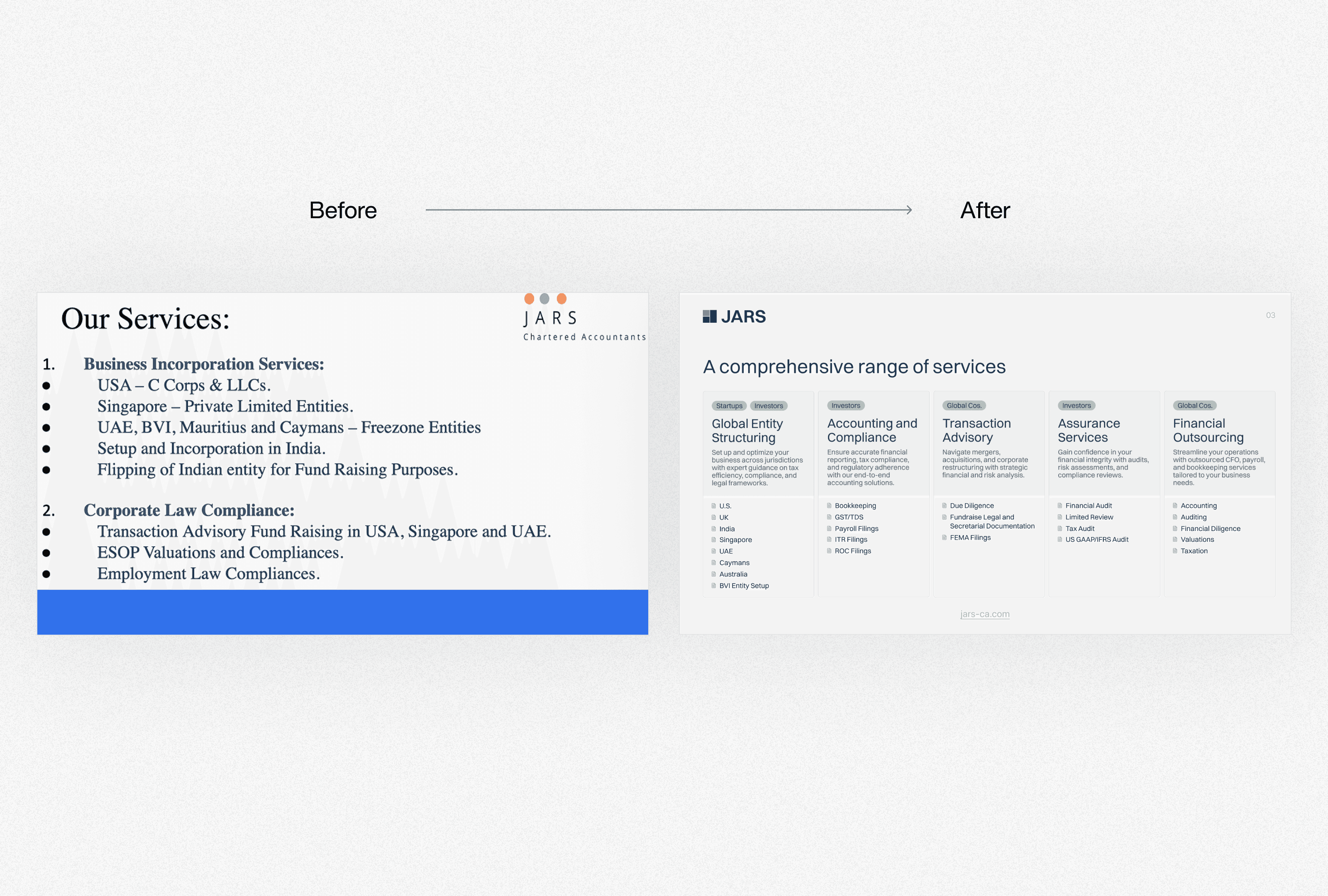 JARS' existing brand lacked authority for international competition in a credibility-driven market. In financial and legal consulting, perception directly impacts trust and client acquisition. Without a stronger identity, JARS risked being overlooked by high-value clients they aimed to serve abroad.