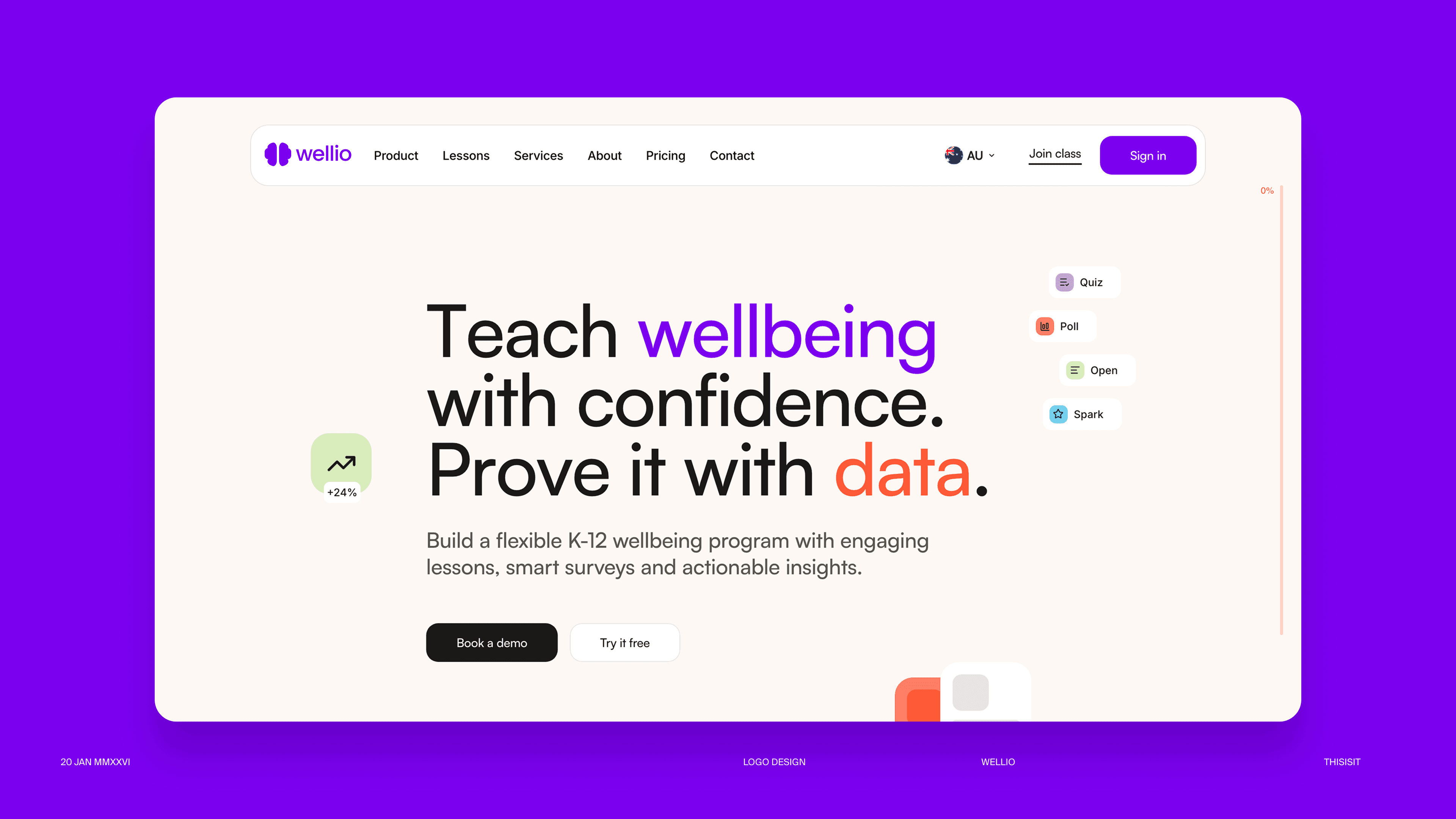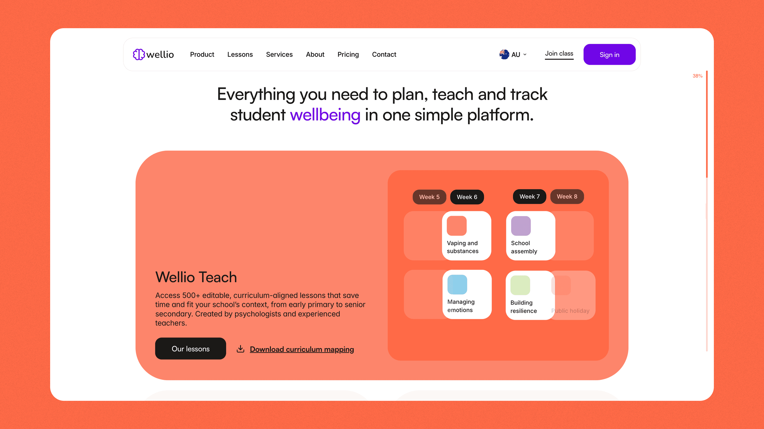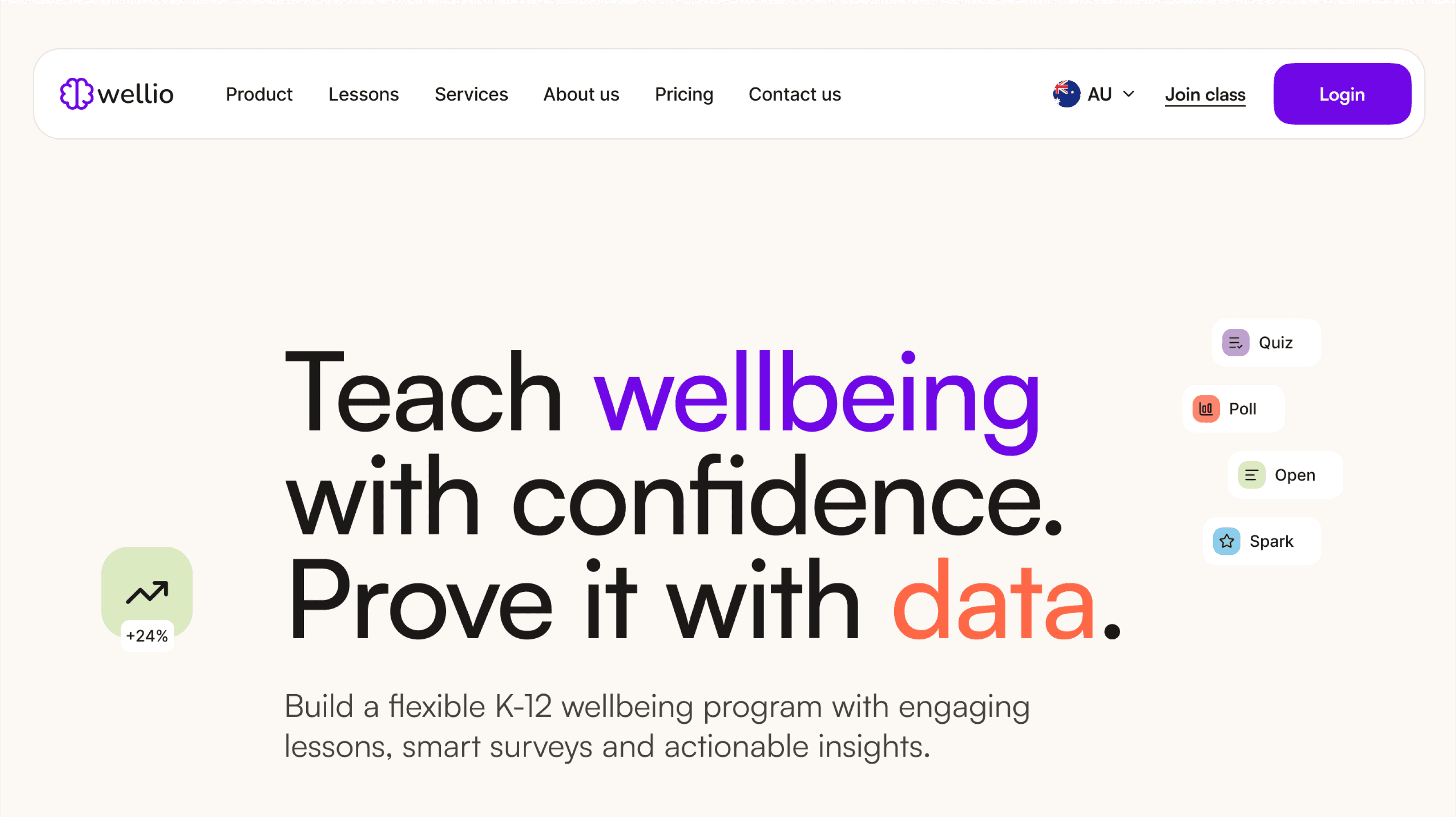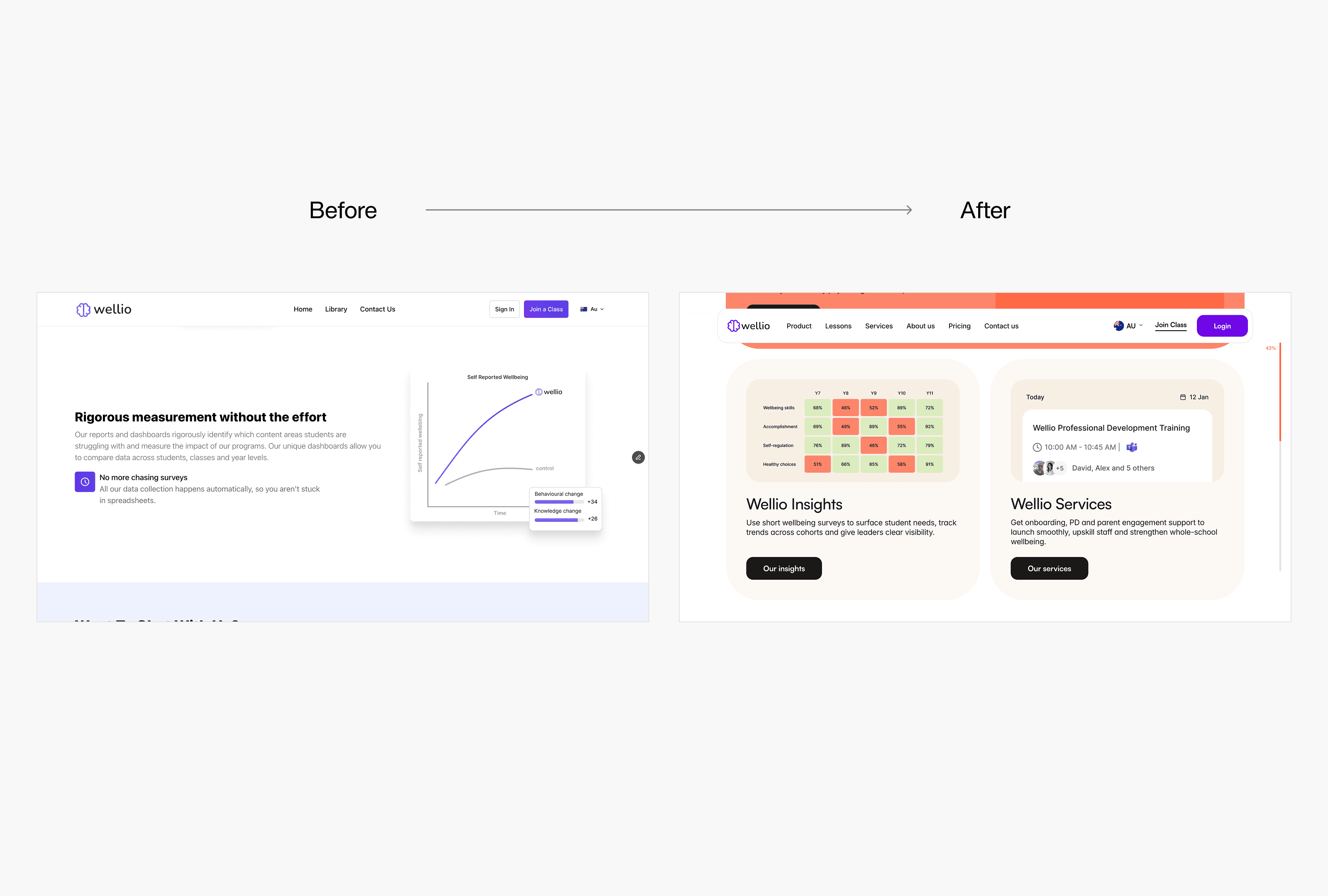 Wellio Education is a digital wellbeing platform used by over 600 primary and secondary schools across Australia and the UK. The platform offers 600+ lessons developed by psychologists and educators, along with survey-driven insights for school leadership. The existing website had been outgrown. A basic Framer build with a homepage, FAQ, and contact page. No product detail, no services overview, no social proof, no clear path for school principals or heads of wellbeing to evaluate and purchase. For a company selling into institutions that take procurement seriously, the digital presence needed to match the maturity of the platform and the trust required by its buyers.